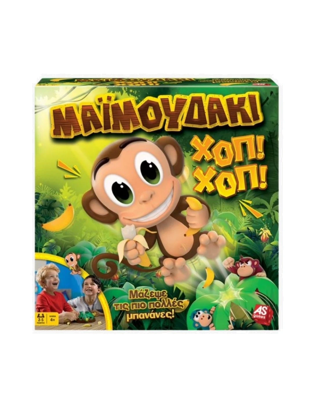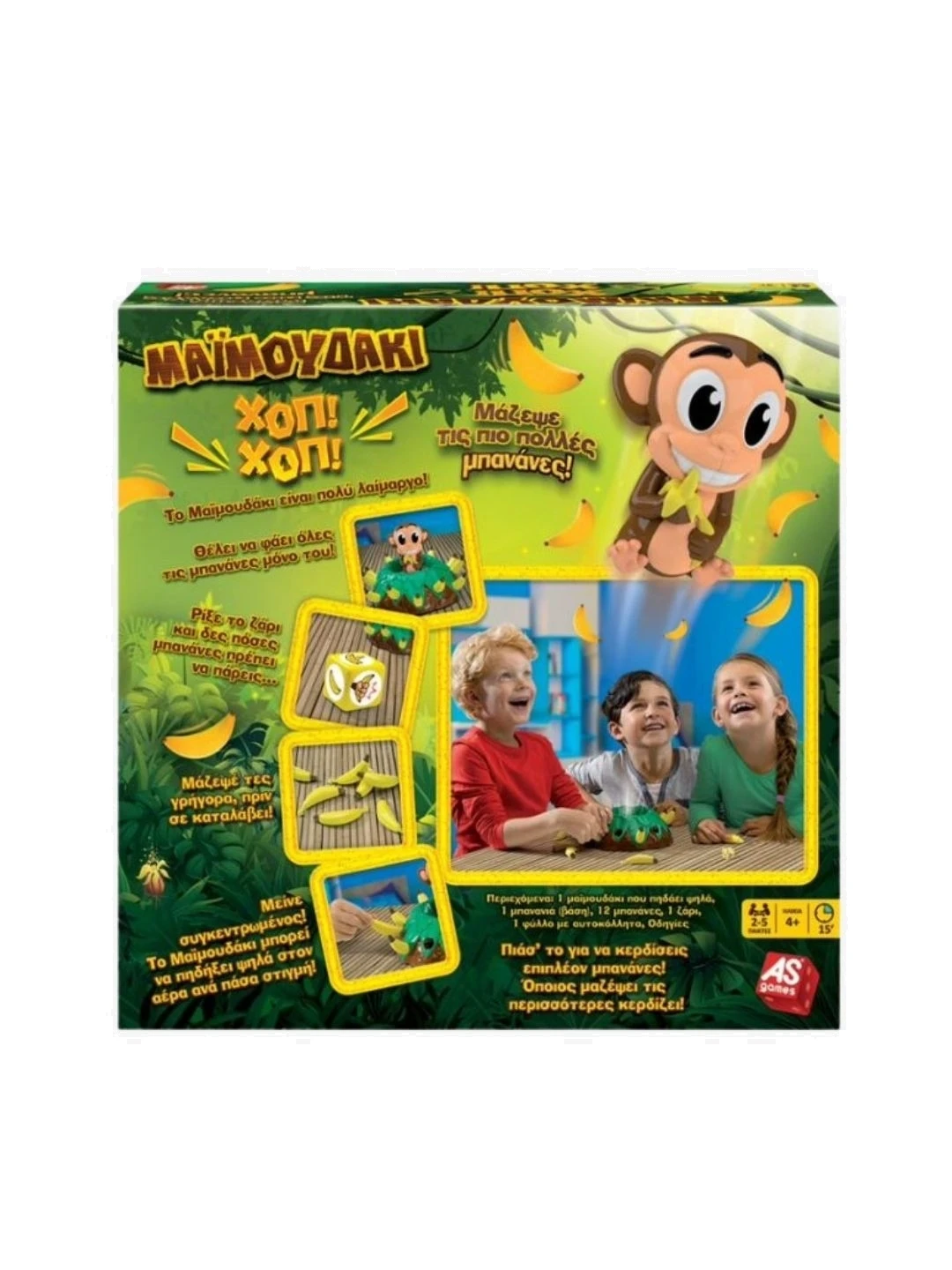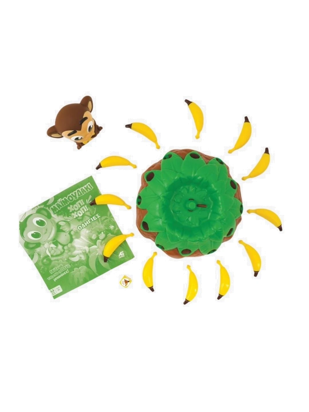 Το Μαϊμουδάκι είναι πολύ λαίμαργο! Θέλει να φάει όλες τις μπανάνες μόνο του γι αυτό και τις προσέχει σαν τα μάτια του!Ρίξε το ζάρι για να δεις πόσες μπανάνες πρέπει να πάρεις από την κορυφή του δέντρου. Μία από τις μπανάνες θα κάνει το μαϊμουδάκι να πηδήξει ψηλά, αλλά δε θα είναι η ίδια μπανάνα κάθε φορά. Προσπάθησε να το πιάσεις πριν πέσει στο έδαφος. Ο παίκτης που τα καταφέρνει παίρνει 2 μπανάνες από έναν άλλο παίκτη και όποιος μαζέψει τις περισσότερες μπανάνες στο τέλος του παιχνιδιού, κερδίζει!