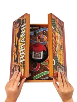 Ένα παιχνίδι σε κουτί από πραγματικό ξύλο, που θα ξε-τρελάνει όλη την οικογένεια! Απειλητικά λιοντάρια, επιθετικοί ρινόκεροι, τρομεροί κροκόδειλοι και άλλα επικίνδυνα πλάσματα – στον επικίνδυνο κόσμο του Jumanji, η καυτή ανάσα τους απέχει μόλις μία ζαριά. Άρπαξε το πιόνι σου, ρίξε το οκτάπλευρο ζάρι με τους αριθμούς και διέσχισε τη ζούγκλα. Λάτρεις της περιπέτειας, προσοχή: μην ξεκινάτε αυτό το ταξίδι αν δεν είστε αποφασισμένοι να το τελειώσετε. Τράβηξε μια κάρτα κινδύνου, χρησιμοποίησε τον αποκωδικοποιητή σου για να ανακαλύψεις το κρυφό μήνυμα και έλπισε για το καλύτερο. Οι συμπαίκτες σου πρέπει να κάνουν αγώνα δρόμου κόντρα στον χρόνο για να σε σώσουν. Η ζούγκλα απειλεί να σε καταπιεί και το Πλέγμα Κινδύνων αρχίζει να γεμίζει με κάρτες. Αν γεμίσει τελείως, η ζούγκλα θα νικήσει εσένα και τους συμπαίκτες σου! Αν φτάσεις πρώτος στο κέντρο προτού συμβεί αυτό, φώναξε “Jumanji!” και είσαι νικητής! Ένα παιχνίδι γι’ αυτούς που ψάχνουν να βρουν… πώς θα ξεφύγουν από τον κόσμο που ζουν.