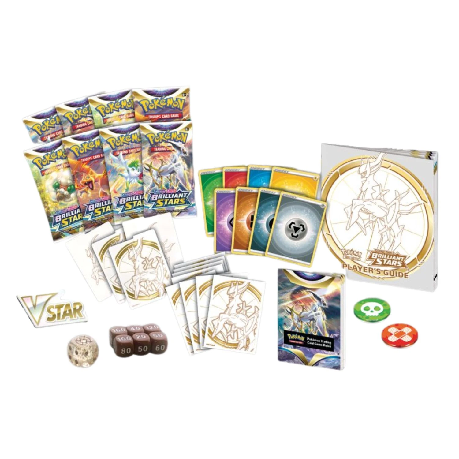 8 αναμνηστικά πακέτα Sword & Shield-Brilliant Stars, 65 θήκες καρτών με τον Arceus, 45 κάρτες ενέργειας Pokemon TCG, Οδηγό παίκτη για την επέκταση Sword & Shield-Brilliant Stars, Ένα βιβλίο κανόνων Pokemon TCG6 ζάρια μέτρησης ζημιών, 1 ζάρι νομιμοποιημένο για διαγωνισμό με κέρμα, 2 ακρυλικούς δείκτες κατάστασης, 1 ακρυλικό δείκτη VSTAR, Ένα συλλεκτικό κουτί για να χωρέσει τα πάντα, με 4 διαχωριστικά για να τα κρατάει οργανωμένα, Μια κάρτα κωδικού για το Pokemon Trading Card Game Live